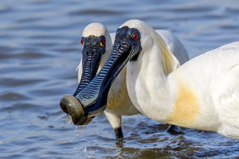 저어새의 부리 길이는 수컷이 19~21 센티미터, 암컷이 16~18 센티미터 정도이며, 이런 숟가락 모양의 부리를 물 속에서 좌우로 흔들면서 물고기, 수생곤충 및 작은 게 등을 잡아먹는다. 4월 중순에 흰색바탕에 흐린 자색과 갈색의 얼룩점이 흩어져 있는 2~4개의 알을 낳는다.